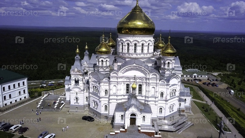 Огромная белая церковь. Вид с беспилотника. Клип. Зеленый пейзаж с храмом со золотыми куполами, стоящими посередине и позади которого зелёный лес и ходящие христиане и голубое небо с облаками. Высококачественное видео 4k