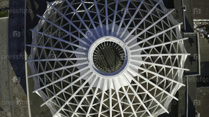 Вид сверху на структуру белого купола. Резервные кадры. Красивое современное здание в центре города летом. Архитектура современного циркового купола из белых металлических арок