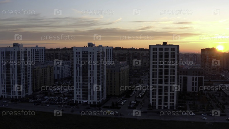 Закат над типичными панельными блоками многоквартирных домов. Резервные кадры. Вид с воздуха на красивый закат над спальной зоной города