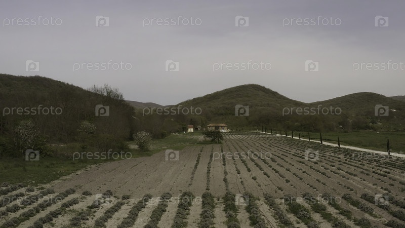 Вид на зеленые поля. Продолжайте. Вид с беспилотника, где молодая пара целует невесту в белом платье и видна ферма