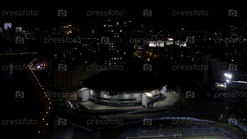 Ночной пейзаж, птичьи ландшафты, вид на глаза. Стоковые кадры. Вид на город в темноте, где можно увидеть футбольное поле, дорогу, высокие здания и большую реку и фонарики, горящие оранжевыми огнями. Высокое качество 4k видео