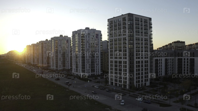Вид на жилой район с многоэтажными зданиями на рассвете. Резервные кадры. Живописный вид на комплекс жилого района с восходом солнца. Панорама жилых комплексов на фоне рассвета