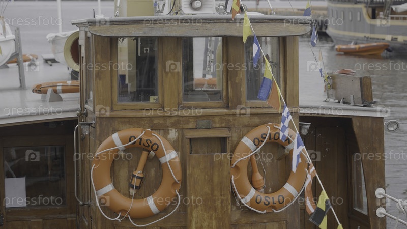 Вид на палубу старой деревянной лодки. Продолжайте. Место для капитана на старом корабле. Небольшое деревянное судно с спасательными буями