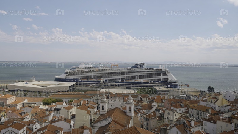 Круизный корабль на берегу древнего европейского города. Идите дальше. Большое туристическое лайнерное судно остановилось в порту древнего города. Туристический круизный корабль в порту европейского города летом
