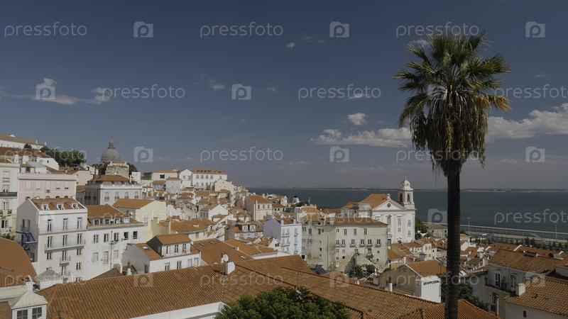 Прекрасный пейзаж европейского города с красными крышами и пальмами. Идите вперед. Древний европейский город с южным климатом у моря. ландшафт холмистого старого города напротив моря в солнечный день