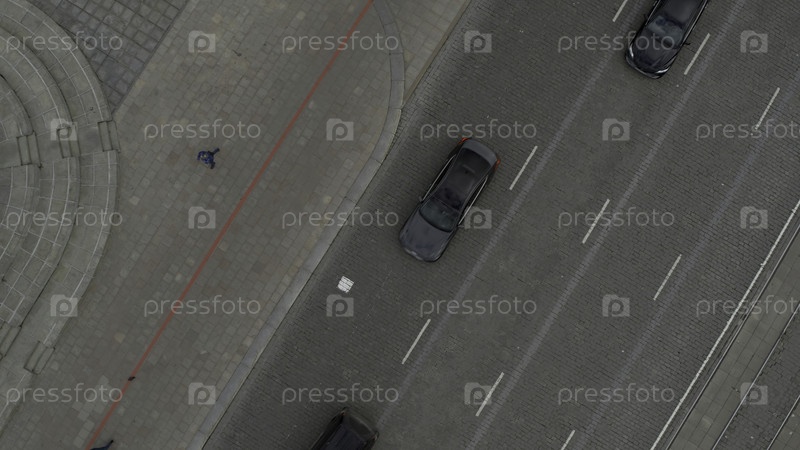 Вид на город асфальтированный автомобилями. Резервные кадры. Летание над дорогами и машинами города. Городская площадь со статуей и движение машин по дороге