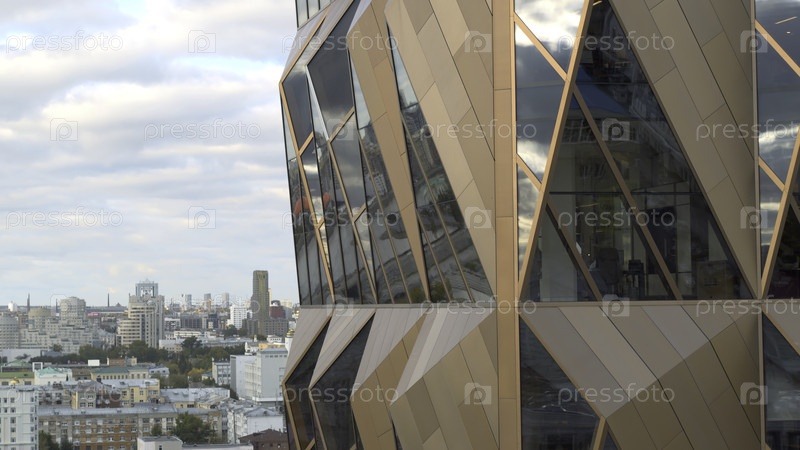 Вид на окна стильного бизнес-центра на фоне города. Резервные кадры. Большие окна в деловом здании в современном городе летом. Панорама города и окна стильного архитектурного здания