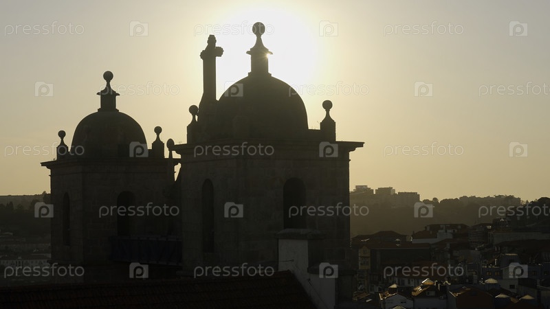 Силуэт каменной церкви на фоне города и солнца Древняя церковь возвышается над городом в солнечный день
