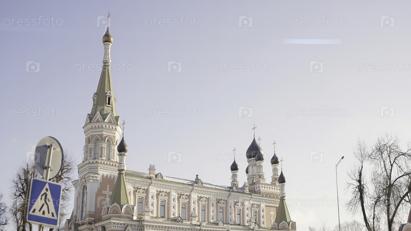 Ландшафт на улице с огромным храмом с небольшими куполами и серыми стволами голых деревьев видны поблизости