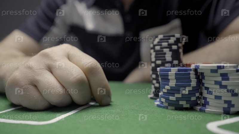 Человек, который играет в покер. Продолжайте. Мужчина держит руку за зеленым игровым столом с большим количеством чипов - это понятие азартных игр