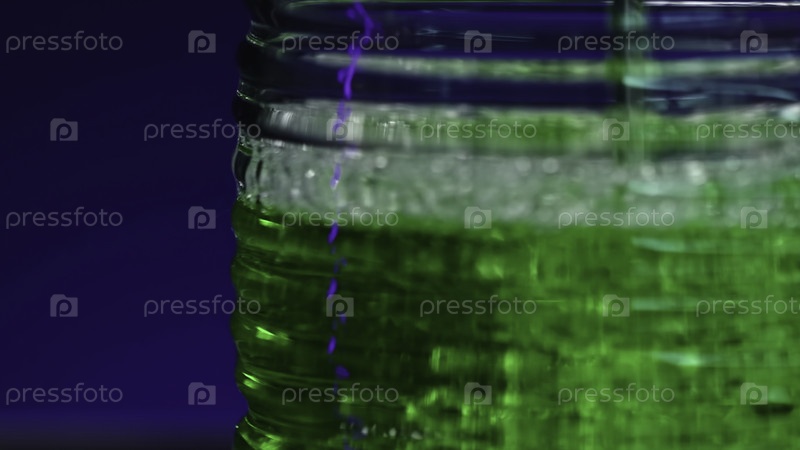 Напиток наливают в прозрачное стекло. Скотч-клип. В стакан заливается зеленый алкогольный напиток. Клубные выпивки в стакане на изолированном фоне