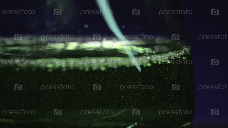 Напиток наливают в прозрачное стекло. Скотч-клип. В стакан заливается зеленый алкогольный напиток. Клубные выпивки в стакане на изолированном фоне