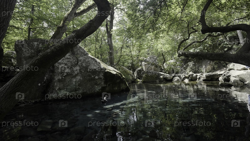 Летний пейзаж. Продолжайте. Красивые заросли тропических деревьев возле небольшого озера, в котором можно увидеть неглубокое дно с камнями. Высококачественный 4k кадры