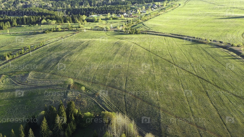 Вид на красивые зеленые поля и леса в солнечный день. Клип. Зеленые поля с дорогами и деревнями в лесистых частях. Пейзаж сельской дороги и домов со зелёными полями и лесами летом