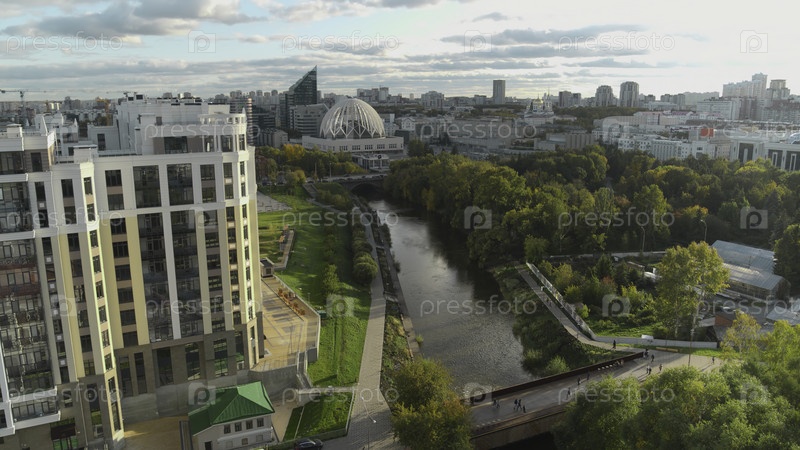 Вид на красивую парковую зону в центре современного города. Резервные кадры. Красивый зеленый парк с рекой в центре города. Хорошо ухоженный парк в центре современного города со стильной архитектурой