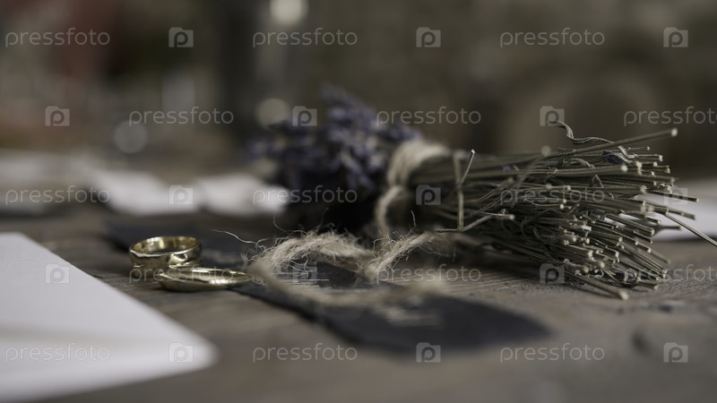 Сухой букет цветов. давай. сушеные фиолетовые цветы, связанные веревками, которые находятся рядом с обручальными кольцами