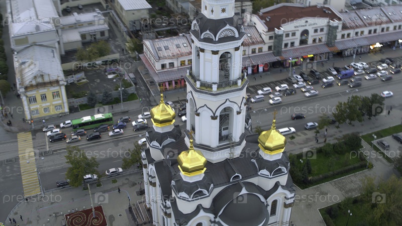 Вид на церковь в центре города. резервные кадры. Красивая архитектура храма или церкви в центре города. Церковь в сердце современного оживленного города летом