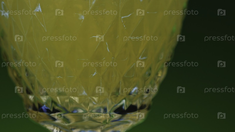 Напиток наливают в прозрачное стекло. Скотч-клип. В стакан заливается зеленый алкогольный напиток. Клубные выпивки в стакане на изолированном фоне
