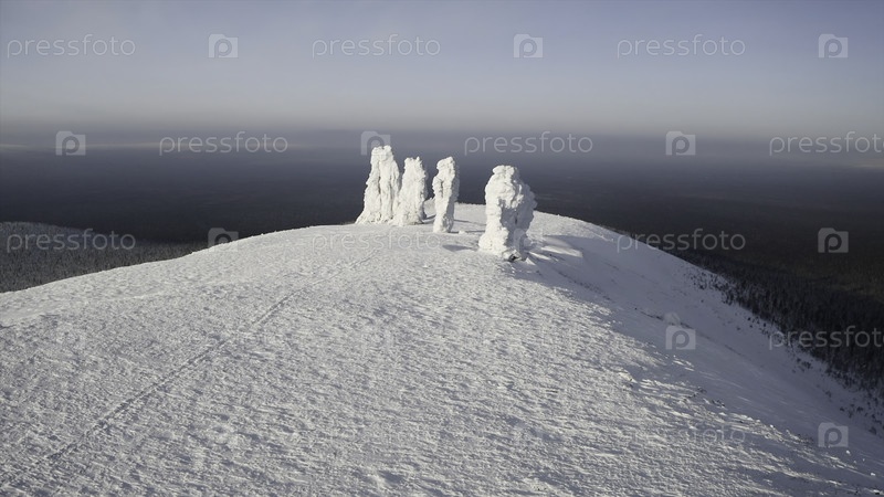 Каменные колонны на холме зимой. Клип. Вид камней, стоящих на холме зимой. Снежные каменные колонны на горе в солнечный зимний день