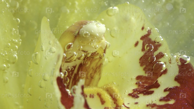 Нежный желтый цветок. Резервные кадры. Чистая вода с небольшими пузырями, которые обволакивают жёлтые лепестки. Высококачественный персонал FullHD