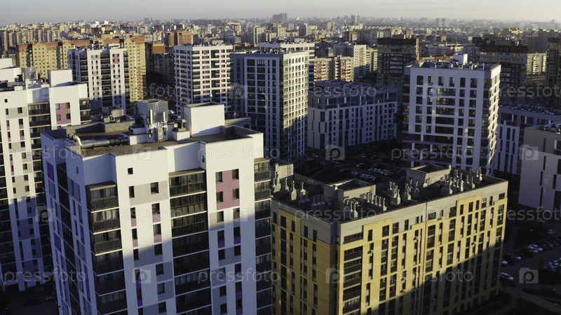 Вид на современные жилые здания в новом районе. резервная запись. Новые многоэтажные дома в жилом районе. Хорошо ухоженный современный район с красивыми домами