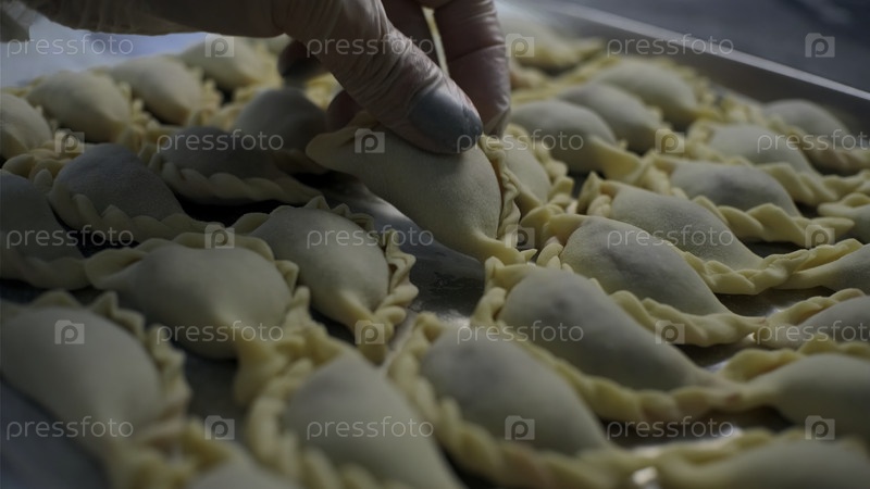 Моделирование различных пельменей и мясных пирогов, которые лежат замороженными на подносе