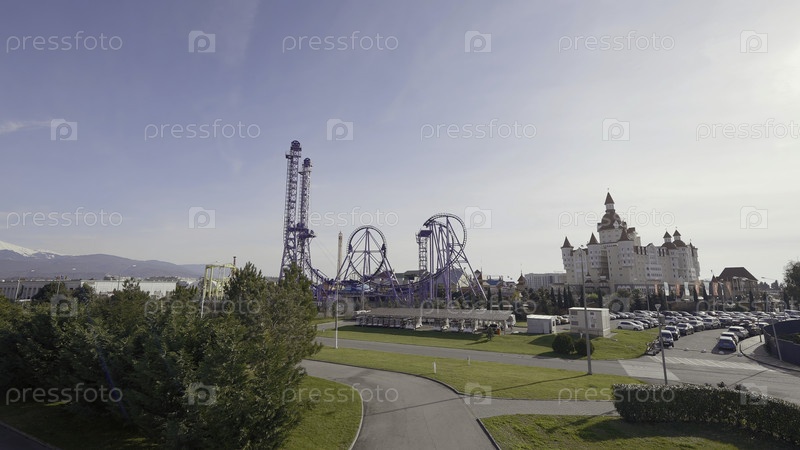 Панорама парка развлечений с замком летом. Идите дальше. Вид на красивую американскую горку со дворцом. Парк развлечений на зеленой лужайке в летний день