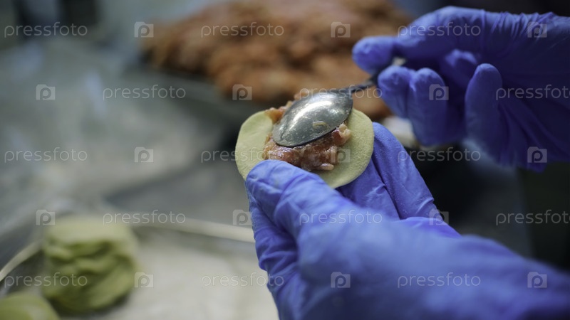Производство русских пельменей на заводе. Клип. Приготовление мясных пельмени или пельмени, размещение измельченной муки на круге теста