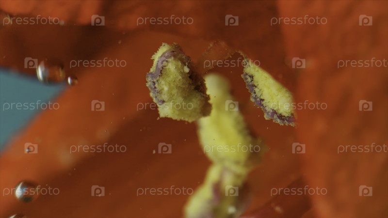 Экстремальное закрытие цветущего красного цвета с желтыми штамменами на бирюзовом фоне. резервные кадры. Цветочный бутон под водой