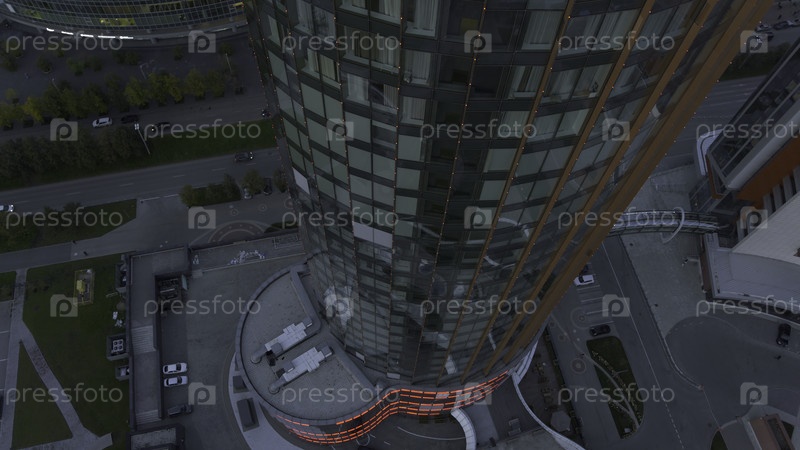 Верхний вид отражения заката солнца в окнах бизнес-небоскреба. резервные кадры. современный небоскреб со стеклянными окнами и отражением. отражение города и закат солнца в окнах делового здания