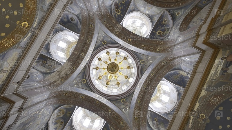 Большой храм с окрашенным потолком с иконами, хорошее освещение и большие окна на потолке