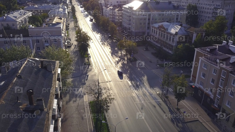Вид на прекрасную городскую дорогу с автомобилем в солнечный день. Городская магистраль с красивыми домами и утренним солнцем летом. Летний город с дорогами и зеленью