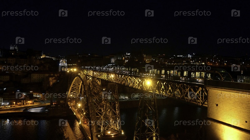 Ночью по городскому мосту проходит наземный поезд. идите вперед. красивый вид на ночной город с светящимся мостом и поездом. поезд ходит по городскому мосту ночью
