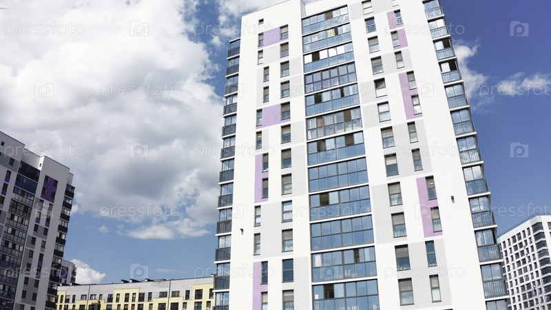 Вид на стильную архитектуру современного района. Резервные кадры. Современная архитектура новых жилых зданий. Ухоженный жилой район с многоэтажными новыми домами