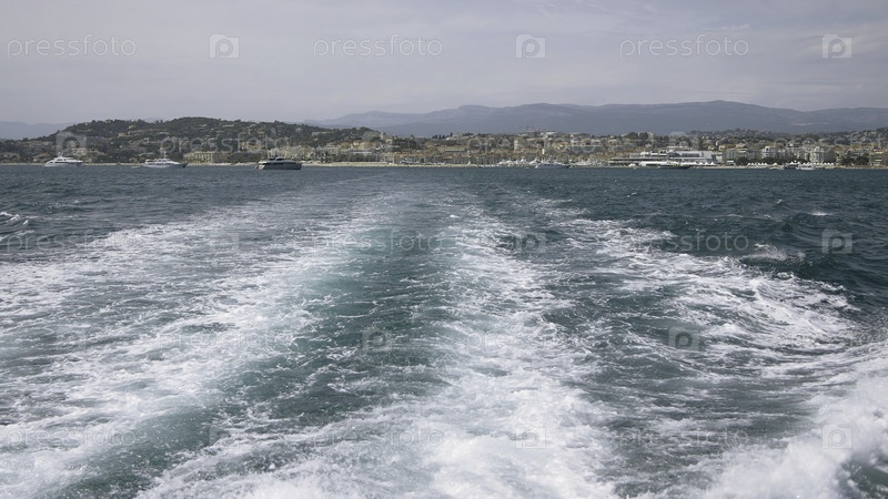 Вид на голубое тихое море. идите вперед. вид с движущейся лодки, которая плавает, создавая волны, а курортный пейзаж виден