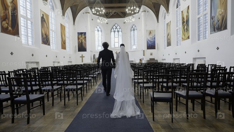 Свадебная церемония только для жениха и невесты в часовне. продолжайте. задний взгляд на мужчину в костюме и женщину в белом платье, идущих вместе в пустых рядах в церкви к алтарю