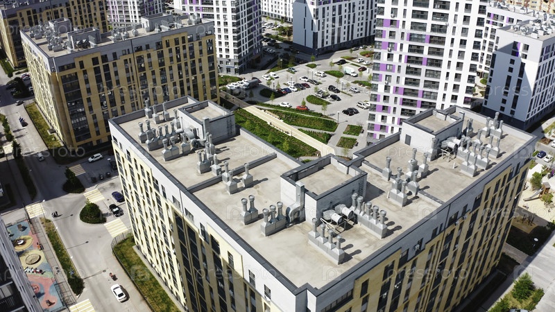 Вид на современные жилые здания в новом районе. резервная запись. Новые многоэтажные дома в жилом районе. Хорошо ухоженный современный район с красивыми домами