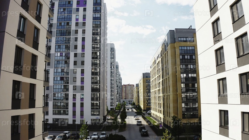 Вид на современные жилые здания в новом районе. резервная запись. Новые многоэтажные дома в жилом районе. Хорошо ухоженный современный район с красивыми домами
