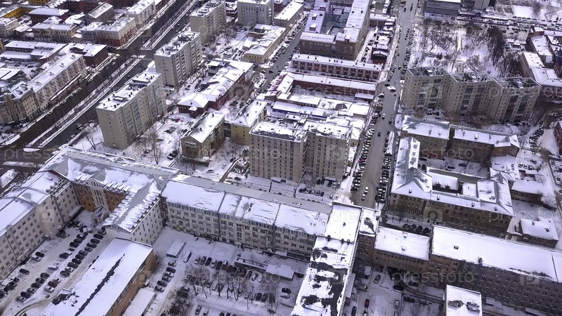 Зимний город с многоэтажными зданиями. Клип. Вид на город из вертолета с узкими улочками и высокими домами. Высококачественная запись 4k