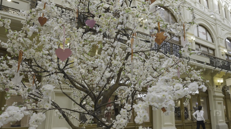 Париж, Франция 14 июля 2022: Красивый торговый центр с цветущим деревом. Идите дальше. Прекрасное цветящее дерево в вестибюле торгового центра. Цветущая яблоня в торговом центре под стеклянной крышей