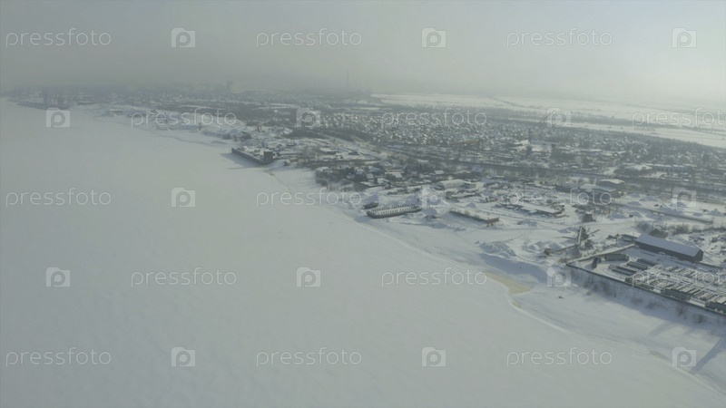 Белый пейзаж в зимнем замороженном городе, где дома и замерзшая река видны под большими снежными днами