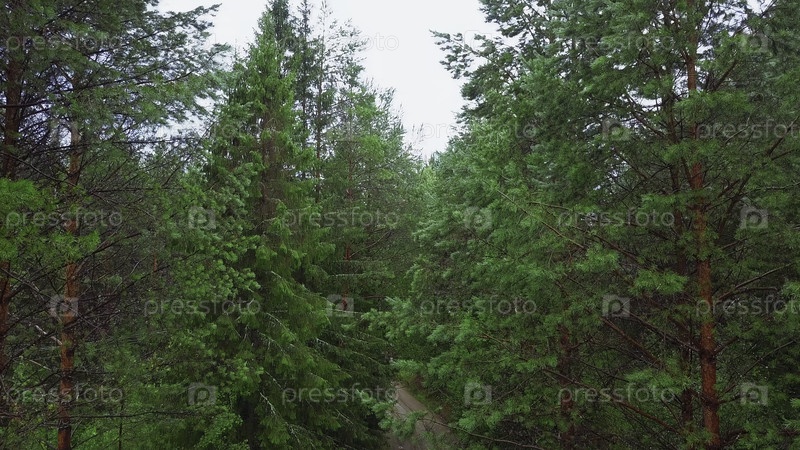 Вид на красивый зеленый лес с иглами. Клип. Зеленые листья хвойных деревьев в лесу. Богатый зелёный лес с хвойными деревьями летом
