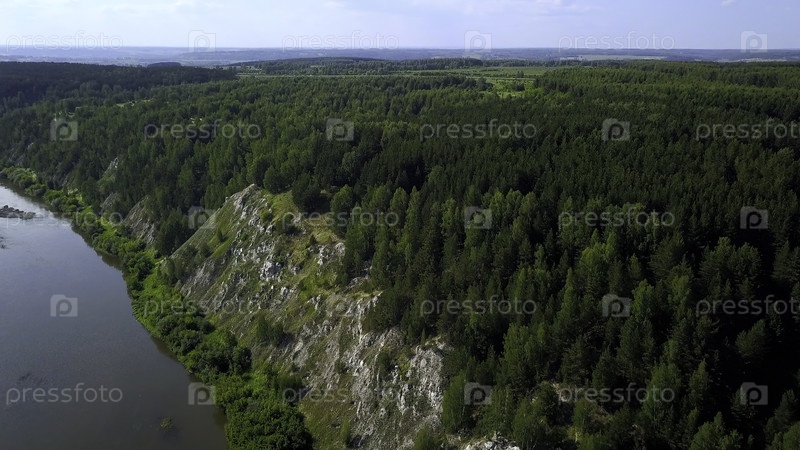 Вид с высоты зеленых лесов и реки внизу и храма, стоящего на расстоянии, а голубое дневное небо видно