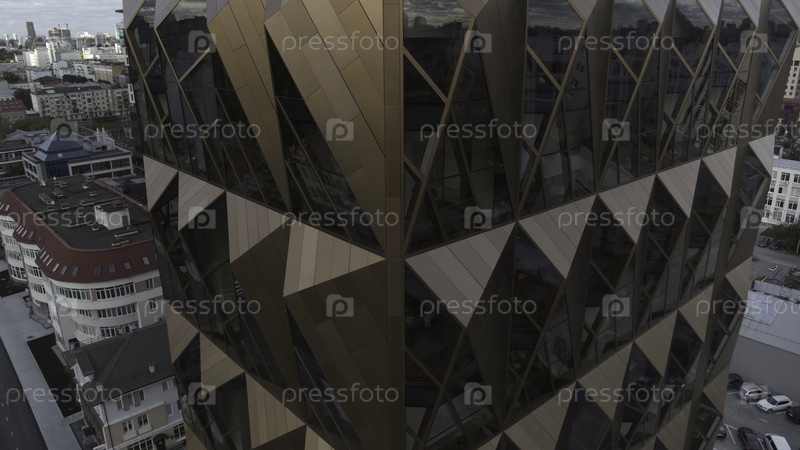 Вид на стильное офисное здание. Резервные кадры. Красивые высокие окна офисного здания на заднем плане города. Экстериор офисного здания в современном городе