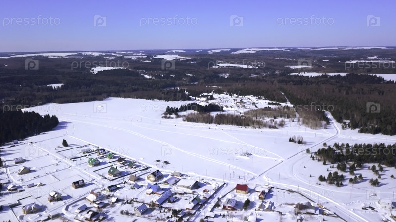 Зимние леса, где видны маленькие дома деревни и большие снежные заносы и голубое небо и большие длинные зеленые деревья под снегом