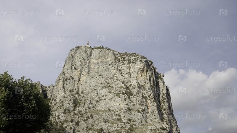 Большая каменная гора с белым храмом. Идите дальше. Красивый пейзаж с горами, которые имеют белый храм и ярко-голубое небо. Высокое качество 4k кадры