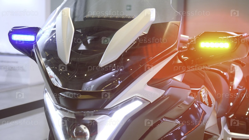 Полиция мигает на мотоцикле СМИ Новая модель мотоцикла для полиции Новое транспортное оборудование с мигающими огнями для полиции