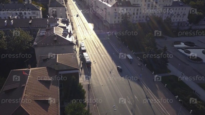Вид на прекрасную городскую дорогу с автомобилем в солнечный день. Городская магистраль с красивыми домами и утренним солнцем летом. Летний город с дорогами и зеленью