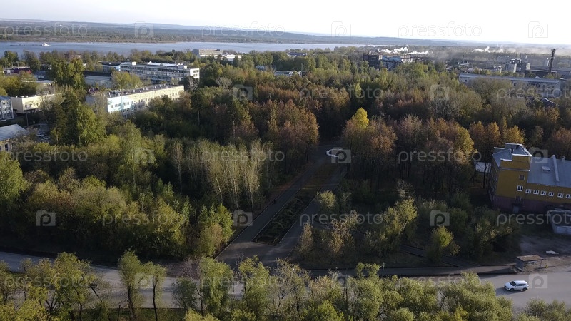Вид на город на фоне реки и осеннего леса. Клип. Пейзаж города с деревьями в солнечный день осени. Город на реке в лесной зоне осенью