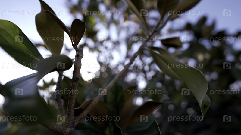 Яркие тропические деревья, расположенные рядом с морем, которые движутся волнами в разных направлениях и видны большие горы